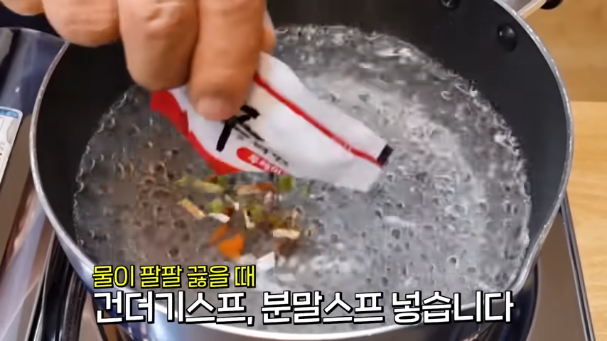 물이 끓으면 건더기 스프를 넣습니다.그 다음, 분말 스프와 라면을 넣고 4분 동안 끓입니다.