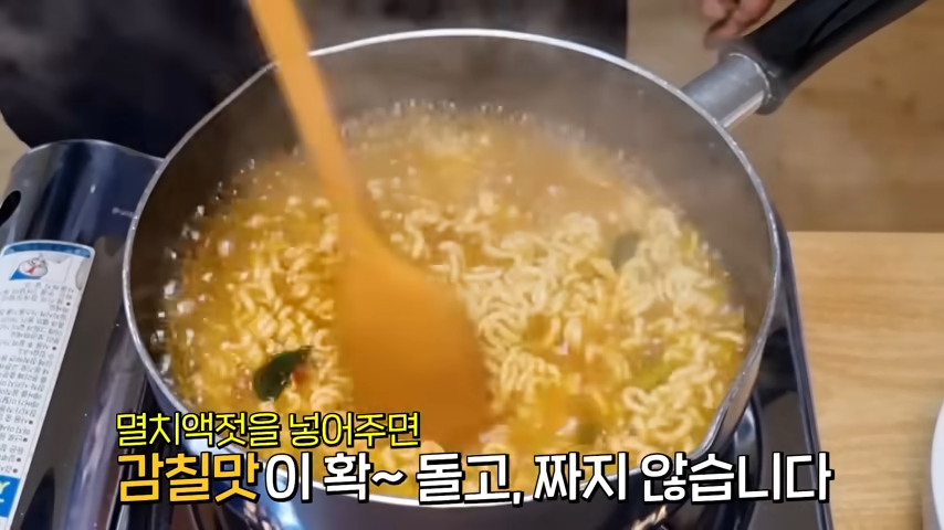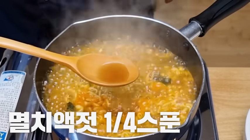 오늘의 포인트는 멸치액젓입니다. 멸치액젓 1/4 스푼을 넣으면 감칠맛이 확 살아납니다. 이 특별한 비법으로 라면의 맛을 한층 더 업그레이드할 수 있습니다.