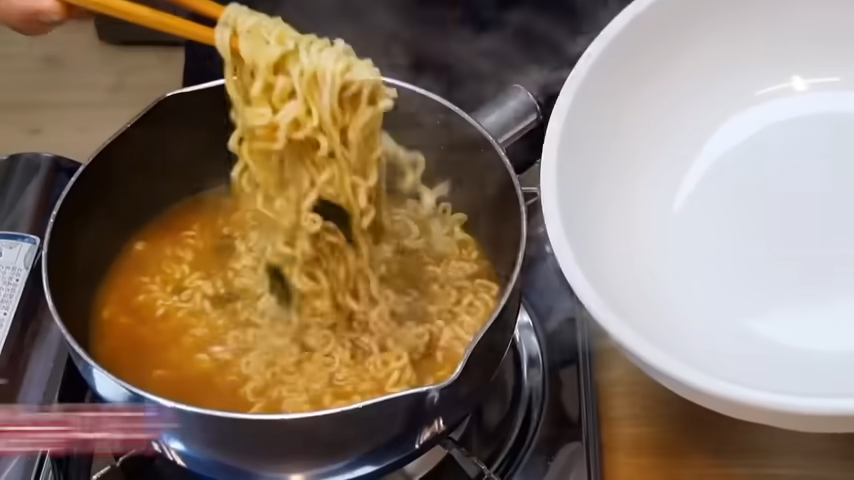 라면이 거의 다 익었을 때, 불을 약간 줄이고 면을 건져내야 면발이 꼬들꼬들하게 유지됩니다.