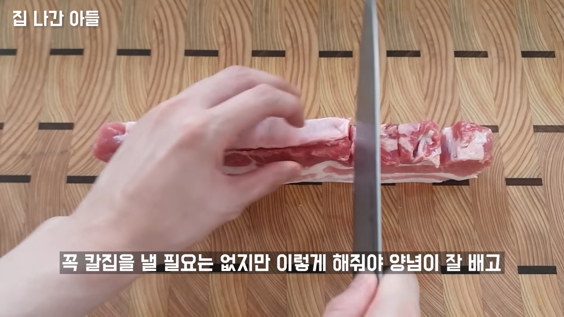 삼겹살 준비: 삼겹살을 적당한 크기로 준비하고, 1~2cm 간격으로 칼집을 내줍니다. 이는 양념이 더 잘 배고 빠르게 익히기 위함입니다.
